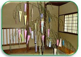 | 玄関の土間に飾られた笹竹に短冊を飾る | 前田鎌利さんの書 |